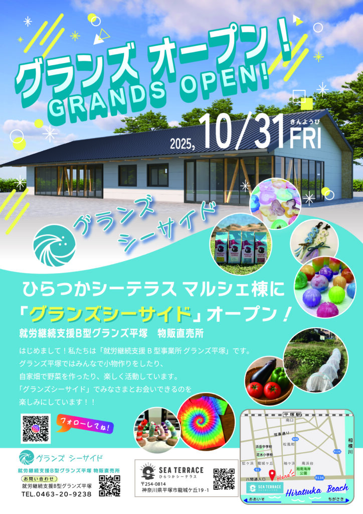 障がい者の就労意欲を高め、自立した日常生活及び社会参加への支援を図るとともに、障がい者に対する理解を深めるため、ひらつかシーテラスのマルシェ棟内に、ひらつか障がい者福祉ショップ「グランズシーサイド」(ふくしのおみせ)を開店いたします。湘南地域で暮らす障がい者と交流する良い機会となりますので、多くの方々のご来店をお待ちしています。